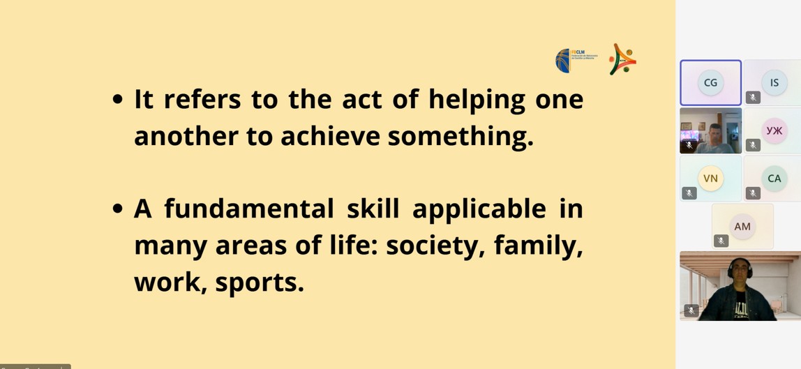 The session began by defining two key concepts: cooperation and teamwork. Cooperation means helping others to achieve a shared objective, while teamwork represents the coordinated and collaborative effort of individuals combining their abilities toward a common goal. In sports, teamwork requires that each player clearly understands their role within the system, communicates effectively, trusts their teammates, and shares both the victories and the defeats.