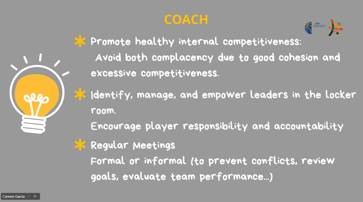 The session also addressed the coach’s responsibility in maintaining a healthy level of internal competitiveness. Coaches should prevent complacency while avoiding destructive rivalry, manage leadership within the team, promote accountability, and lead by example through credibility, involvement, and consistency. Regular team meetings and open conversations were recommended as tools for maintaining alignment and focus.