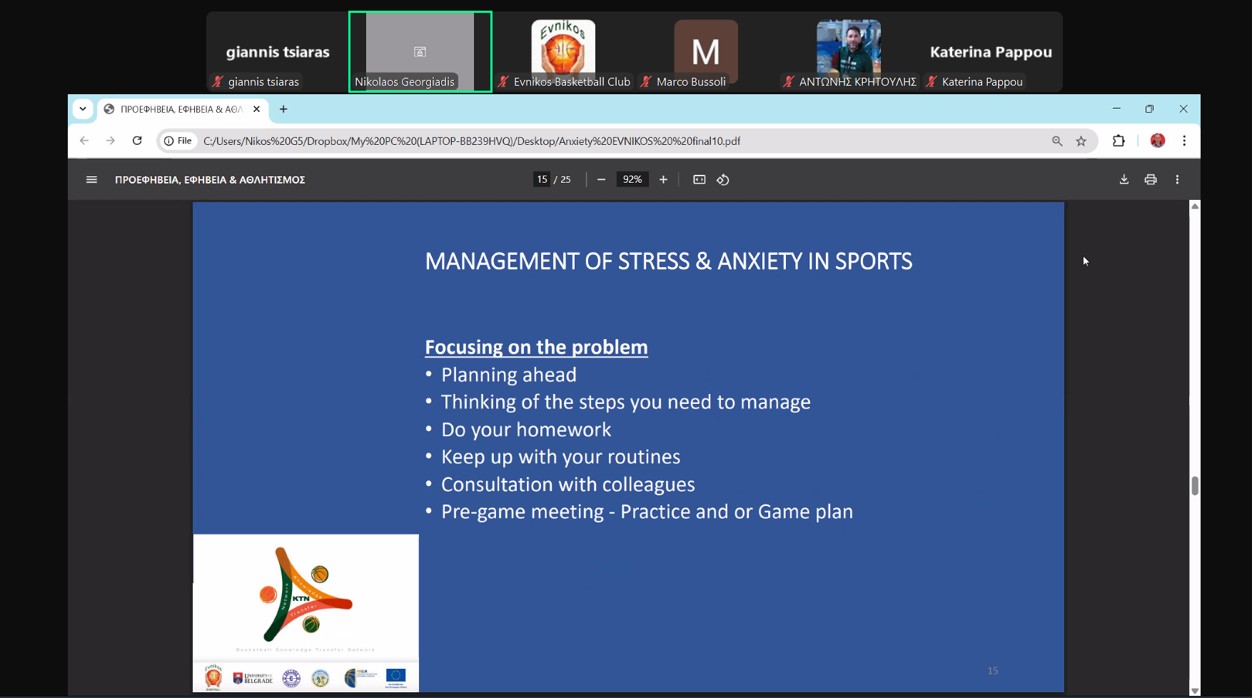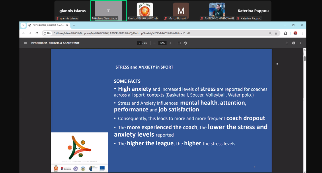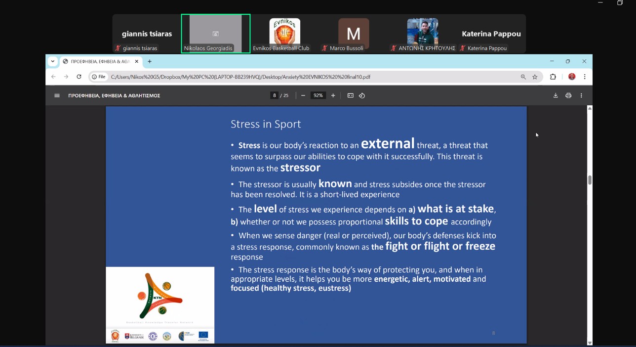 As part of the knowledge transfer and education activities within the Basketball-KTNproject, EVNIKOS Sports Club organized a two-part seminar on April 4 and 7, 2025, dedicated to one of the most important aspects of modern sport — the psychological dimension of performance. The sessions addressed how conflict, stress, and anxiety influence athletes, teams, and organizations, emphasizing practical tools for prevention, resolution, and mental well-being.